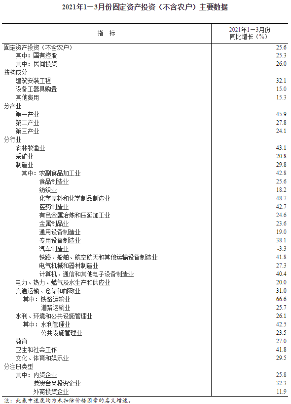 1—3月份,全国固定资产投资(不含农户)95994亿元,同比增长25.6%;比2019年1—3月份增长6.0%,两年平均增长2.9%;经季节调整后与去年10—12月份环比增长2.06%。其中,民间固定资产投资55022亿元,同比增长26.0%。从环比看,3月份固定资产投资(不含农户)增长1.51%。