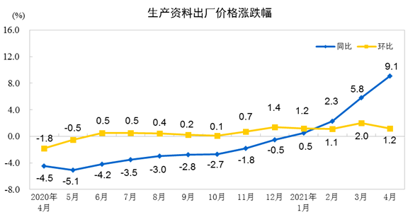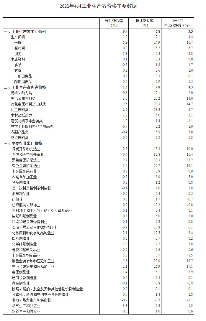 2021年4月份工业生产者出厂价格同比上涨6.8% 环比上涨0.9%