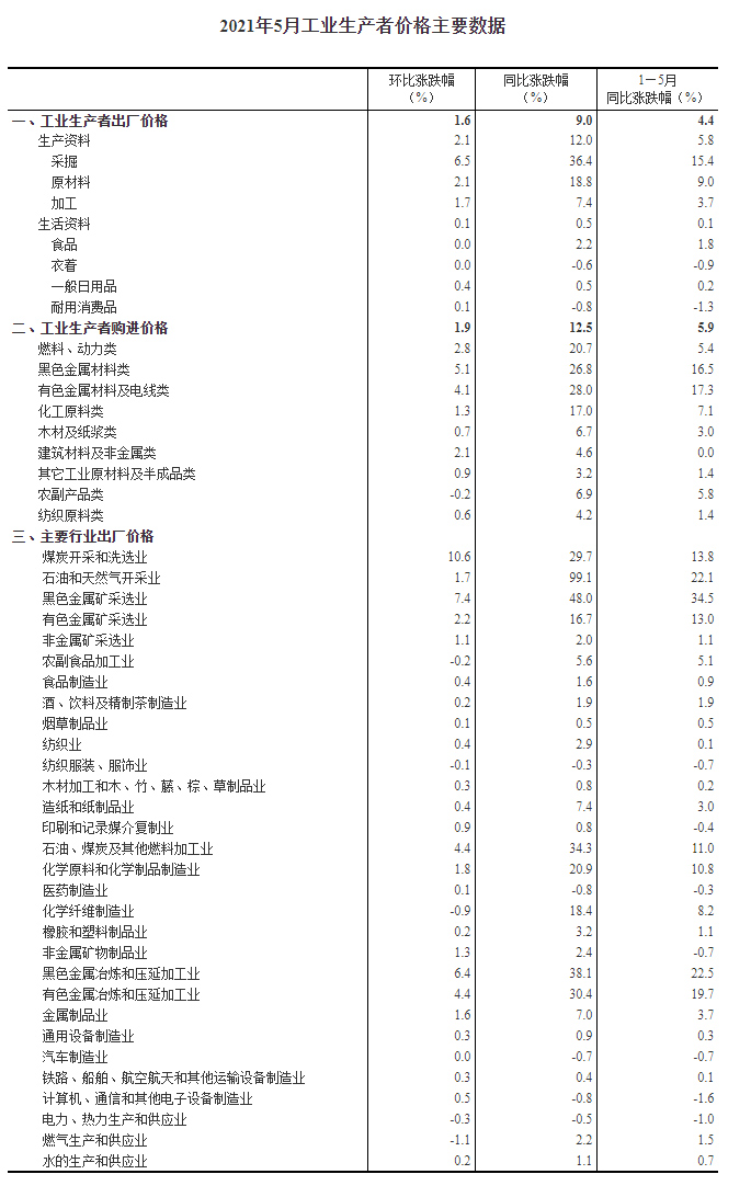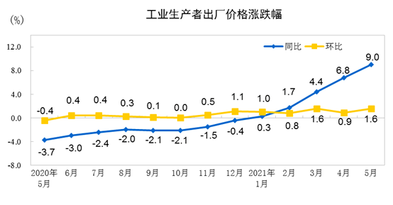 2021年5月份工业生产者出厂价格同比上涨9.0% 环比上涨1.6%