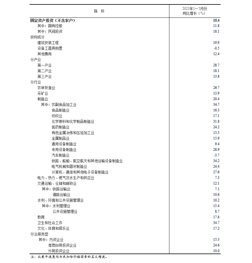 2021年1—5月份全国固定资产投资(不含农户)增长15.4% 比2019年1—5月份增长8.5%