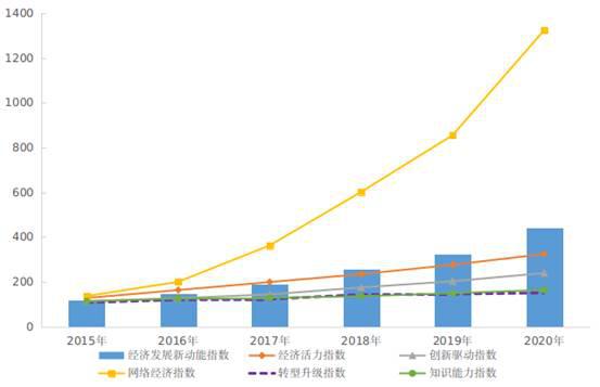 为动态监测我国经济发展新动能变动情况,国家统计局统计科学研究所在《新产业新业态新商业模式统计监测制度》和经济发展新动能统计指标体系的基础上,采用定基指数方法测算了2020年我国经济发展新动能指数,并修订了2015-2019年历史指数数据。结果显示,2015-2020年我国经济发展新动能指数(以2014年为100)分别为119.6、146.9、191.2、257.9、325.5和440.3,分别比上年增长19.6%、22.8%、30.2%、34.9%、26.2%和35.3%。2020年,各项分类指数与上年相比均有提升,其中,网络经济指数增长最快,对总指数增长的贡献最大。