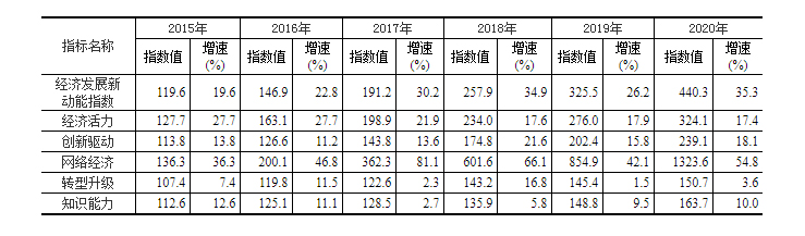 2015-2020年经济发展新动能指数、分类指数及其增速