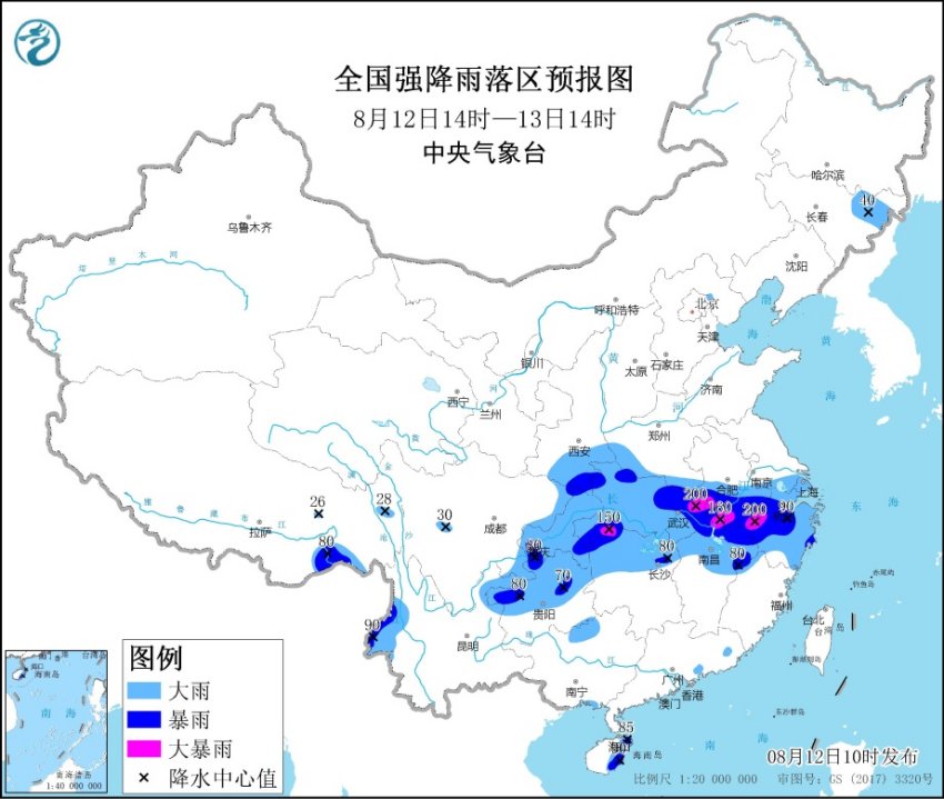 预计,8月12日14时至13日14时,江淮中西部、江汉、江南北部、西南地区东部以及华南南部等地部分地区有大到暴雨,其中,湖北东部和西南部、安徽中南部、湖南西北部、江西北部、浙江西北部等地局部地区有大暴雨(100~200毫米)。上述部分地区伴有短时强降水(最大小时降雨量20~50毫米,局地可超过80毫米),局地有雷暴大风等强对流天气。