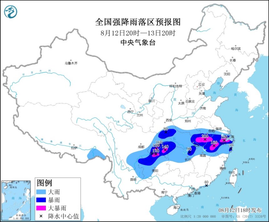预计,8月12日20时至13日20时,西南地区东部、江汉大部、江淮中西部、江南北部以及华南南部沿海、西藏南部等地的部分地区有大到暴雨,其中,安徽中南部、湖北东部和西南部、江西北部、浙江北部、重庆西部和东南部、贵州北部等地的局部地区有大暴雨(100~200毫米)。上述部分地区伴有短时强降水(最大小时降雨量20~50毫米,局地80~100毫米),局地有雷暴大风等强对流天气。