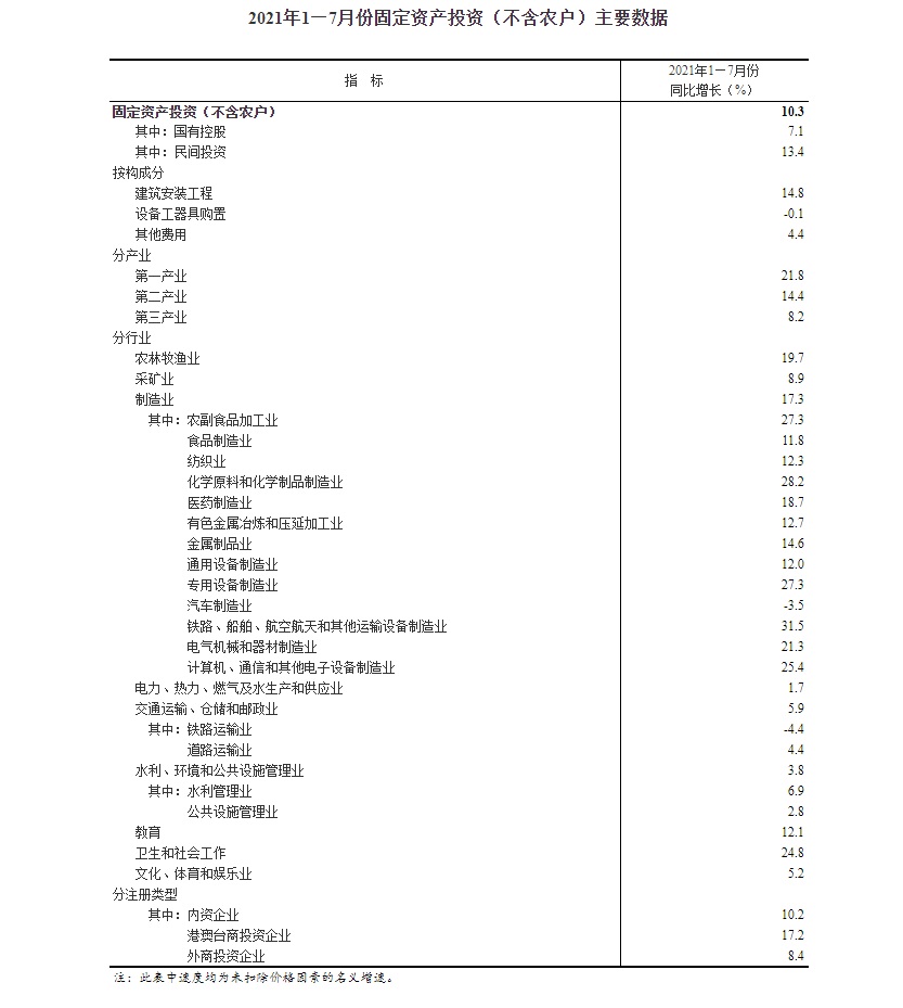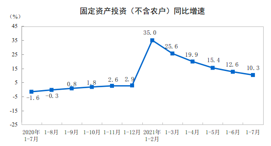 2021年1—7月份全国固定资产投资(不含农户)增长10.3%