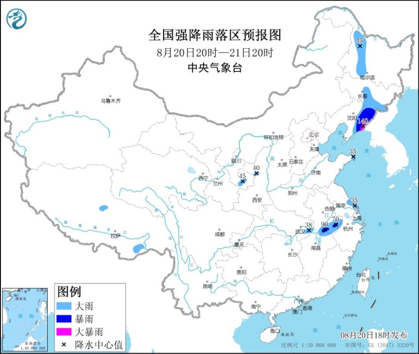 预计,8月20日20时至21日20时,辽宁东部、吉林东南部、黑龙江西部、山东半岛东部、江苏东南部、安徽南部、浙江西北部、江西北部、湖北东部以及甘肃东部等地的部分地区有大到暴雨,其中,辽宁东南部等地局地有大暴雨(100~140毫米)。上述部分地区伴有短时强降水(最大小时降雨量20~50毫米,局地可超过60毫米),局地有雷暴大风等强对流天气。