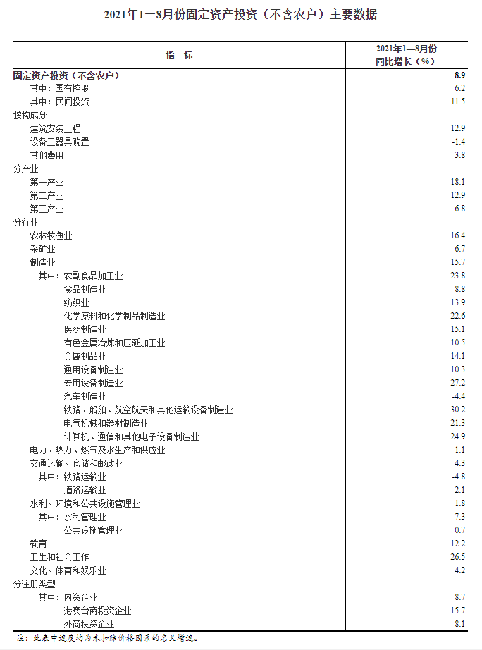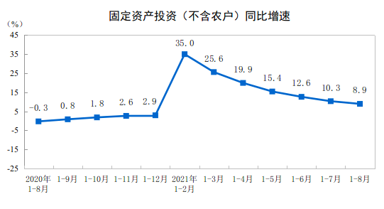 2021年1—8月份全国固定资产投资(不含农户)增长8.9%
