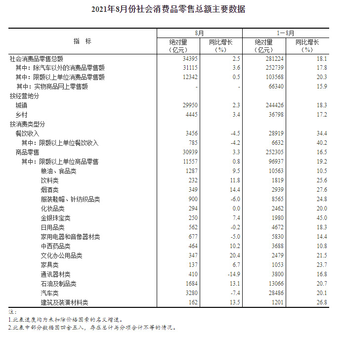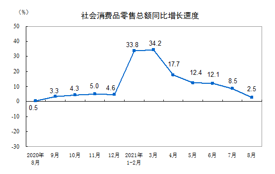 2021年8月份社会消费品零售总额增长2.5%