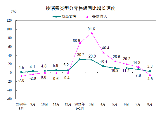 按消费类型分,8月份,商品零售30939亿元,同比增长3.3%;餐饮收入3456亿元,同比下降4.5%。1—8月份,商品零售252305亿元,同比增长16.5%;餐饮收入28919亿元,增长34.4%。