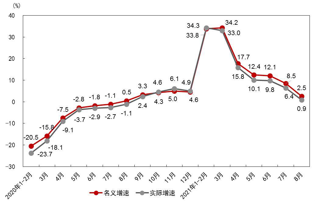 新冠肺炎疫情等短期因素对消费市场冲击较大。8月份,国内多地发生疫情,疫情波及全国一半以上省份,居民外出购物、旅行减少,市场销售增速回落幅度较大。此外,去年8月份社会消费品零售总额增速为年内首次转正,“基数效应”对本月市场销售增长也产生一定影响。今年8月份,社会消费品零售总额同比增长2.5%,增速比7月份回落6个百分点;其中,餐饮住宿等聚集型消费受疫情冲击更为明显,餐饮收入同比下降4.5%,而7月份为增长14.3%。但从限额以上单位18个商品类别看,六成以上商品零售额保持增长。