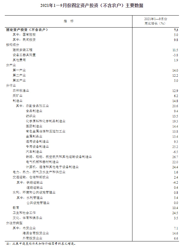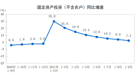 2021年1—9月份全国固定资产投资(不含农户)增长7.3%