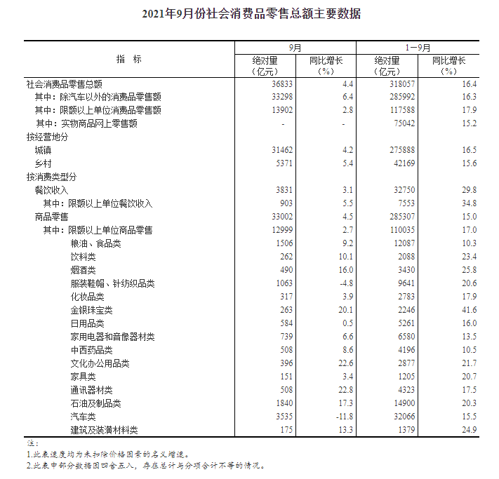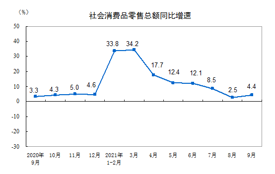 2021年9月份社会消费品零售总额增长4.4%