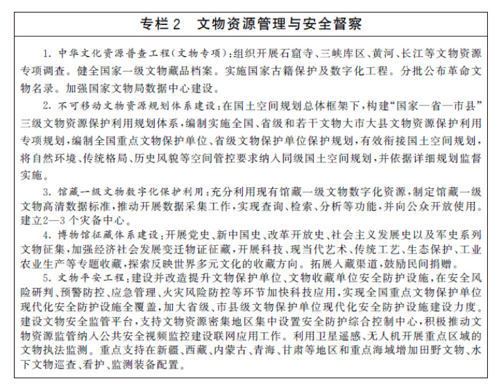 实施文物平安工程,加大古遗址、古墓葬、石窟寺石刻等防盗窃盗掘预警技术研发应用和相关装备配置力度。加强博物馆和文物建筑等火灾防控、洪涝监测预警、地震和地质灾害防控信息技术应用和应急管理体系建设。加强卫星遥感、无人机、大数据等科技手段在文物安全监测和执法督察中的应用。