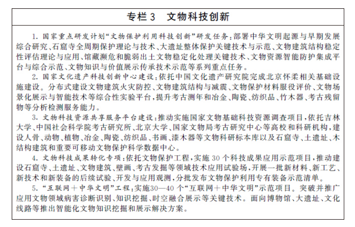 面向文物防、保、研、管、用等五大需求领域,在国家重点研发计划中部署“文物保护利用科技创新”等研发任务,突破一批关键材料、工艺、装备和集成技术。大力发展文物灾害风险防控、火灾防范与应急处置专用技术体系;重点突破石窟寺、土遗址和木结构建筑等文物病害探测、原位诊断、防治和保护工程质量评价关键技术,优化系统解决方案;加快攻克饱水象牙、贝叶经、粉化甲骨、简牍等抢救性保护技术难题;持续推动考古探测、残留物检测、工艺鉴别、产地溯源等技术升级,增强考古发现提取与综合分析能力;研究文物资源保护规划关键技术,推进文物资源管理智能化;研究构建文物知识图谱,开展文物展示传播技术创新应用示范。