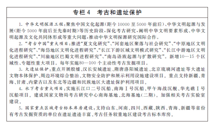 编制并实施“十四五”考古工作专项规划。系统确定考古发掘重点,深化中华文明探源工程,推进“考古中国”重大项目,科学阐释中国境内人类起源、文明起源、中华文明形成、统一多民族国家建立和发展、中华文明在世界文明史中的重要地位等关键问题,揭示中华文明的历史文化价值和核心特质。