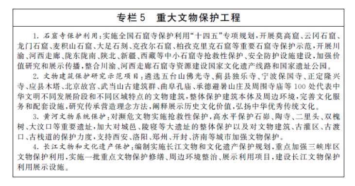 实施重要木结构文物建筑保护修缮工程。加强长城、大运河、丝绸之路以及中东铁路等线性文化遗产重要点段保护修缮。实施全国重点文物保护单位、省级文物保护单位密集区域保护提升工程,整体保护文物本体和改善周边环境。实施黄河文物系统保护,加强长江文物和文化遗产保护,推进首都功能核心区、三峡库区文物保护利用。加强石窟寺保护管理,健全国家和区域两级石窟寺保护研究协调机制。