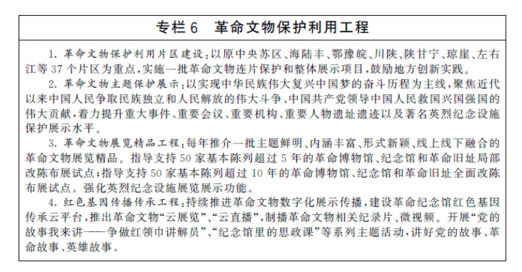 整合文物、党史、军史、档案、地方志等方面研究力量,加强革命文物保护利用研究,开展实物、文献、档案、史料和口述史征集,挖掘革命文物深刻内涵,推出重要研究成果,旗帜鲜明反对和抵制历史虚无主义,继续发扬伟大建党精神,传承弘扬井冈山精神、长征精神、遵义会议精神、延安精神、西柏坡精神、红岩精神、抗美援朝精神、“两弹一星”精神、特区精神、抗洪精神、抗震救灾精神、抗疫精神、脱贫攻坚精神等伟大精神。