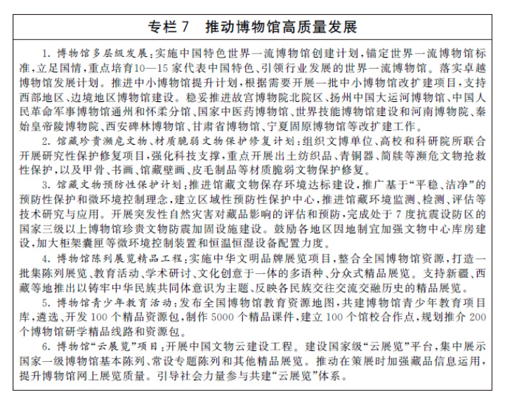 实施中国特色世界一流博物馆创建计划。支持省级、重要地市级博物馆特色化发展。盘活基层博物馆资源。探索建立行业博物馆联合认证、共建共管机制。规范和扶持非国有博物馆发展,落实支持政策,依法依规推进非国有博物馆法人财产权确权。认真履行相关审批程序,有序推动建设一批反映党和国家建设成就的当代主题博物馆和行业博物馆,重点支持建设反映中华文明发展历程的国家级重点专题博物馆,倡导建设特色专题博物馆。探索在文化资源丰厚地区建设“博物馆之城”。