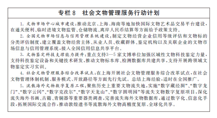 营造健康的文物市场环境,培育现代文物市场体系,优化文物市场区域布局。强化文物商店作用,探索降低文物商店准营门槛,推动国有文物商店改革。培育一批具有市场美誉度和国际影响力的文物拍卖龙头企业,扶持中小文物经营主体。支持发展现代经营方式,推动文物市场线上线下融合,支持在线展示、交易和定制服务等新业态发展。完善民间收藏文物登记交易制度,建设全国文物市场信息与信用管理系统,完善文物流通信用体系、文物市场全流程协同监管机制。