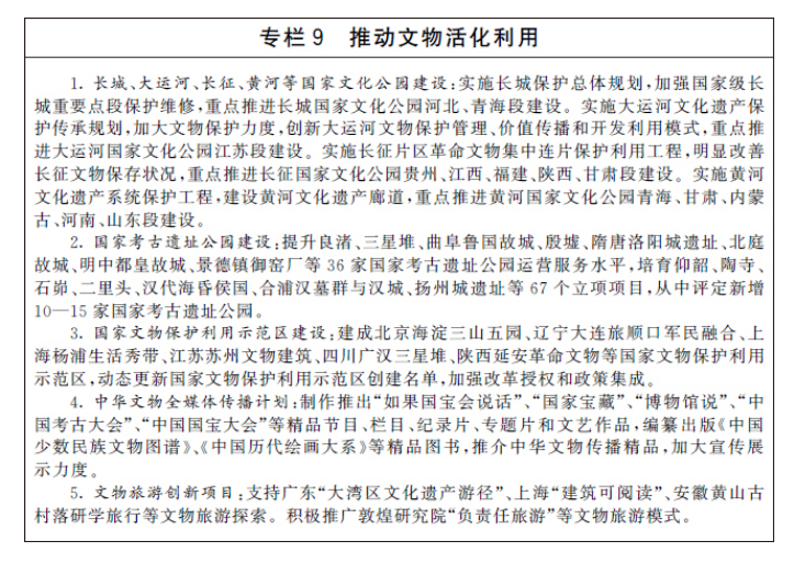 创新文物保护利用机制,加强文物和文化遗产保护利用,建设国家文物保护利用示范区。健全国有文物资源资产管理制度,推进文物资源资产管理信息共享,部署开展相关试点工作。完善各方主体参与文物保护利用的支持政策,保障利益相关方合法权益。探索创新对文物资源密集区的支持方式。建设文物领域国家智库。
