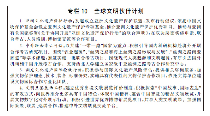 深化在濒危文化遗产抢救保护、打击文化财产非法贩运、武装冲突地区文化遗产保护、水下文物保护、世界文化遗产管理、流失文物追索返还、博物馆等领域的国际合作,积极履行国际责任,提升中国话语权。打造文化遗产国际智库,加强专业人才培养。