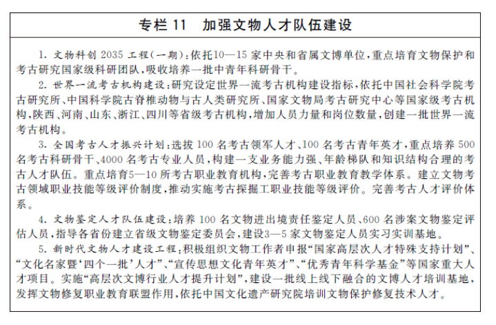 培育一批以领军人才和中青年骨干创新人才为重点的高层次文物人才,加强考古、科技创新、文物鉴定、文物修复、文物展览等急需领域人才培养,加快建设一支门类齐全、技艺精湛的文物技能人才队伍,稳步造就一支科技研发能力和技术应用能力过硬的文物科技人才队伍,锤炼一支熟悉专业、素质优良的文物管理人才队伍。加强相关行业文物保护人才培养。