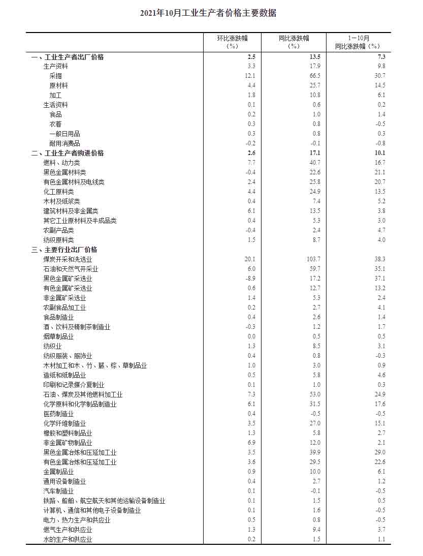 2021年10月份,全国工业生产者出厂价格同比上涨13.5%,环比上涨2.5%;工业生产者购进价格同比上涨17.1%,环比上涨2.6%。1—10月平均,工业生产者出厂价格比上年同期上涨7.3%,工业生产者购进价格上涨10.1%。
