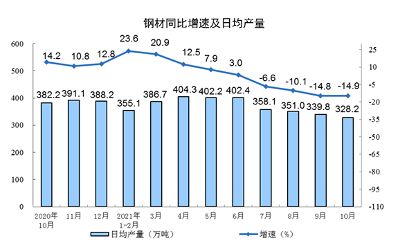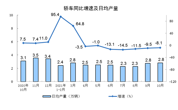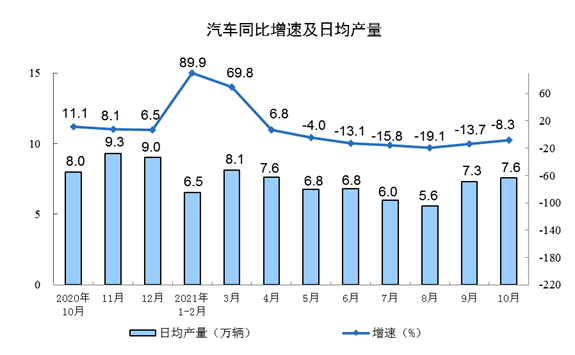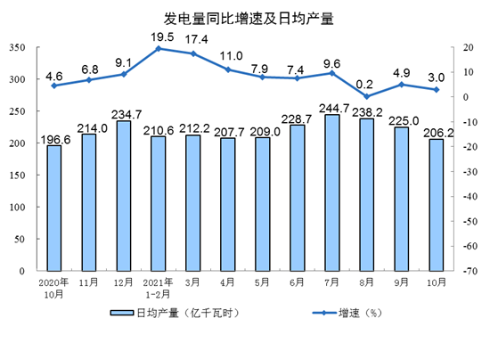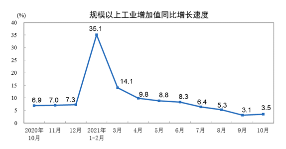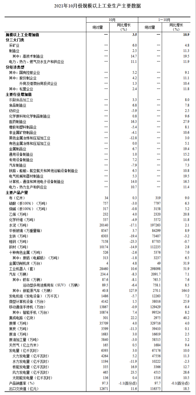 10月份,规模以上工业增加值同比实际增长3.5%(以下增加值增速均为扣除价格因素的实际增长率),比2019年同期增长10.6%,两年平均增长5.2%。从环比看,10月份,规模以上工业增加值比上月增长0.39%。1—10月份,规模以上工业增加值同比增长10.9%,两年平均增长6.3%。