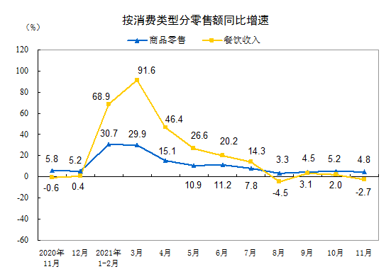 按消费类型分,11月份,商品零售36200亿元,同比增长4.8%;餐饮收入4843亿元,同比下降2.7%。1—11月份,商品零售357501亿元,同比增长12.8%;餐饮收入42054亿元,增长21.6%。
