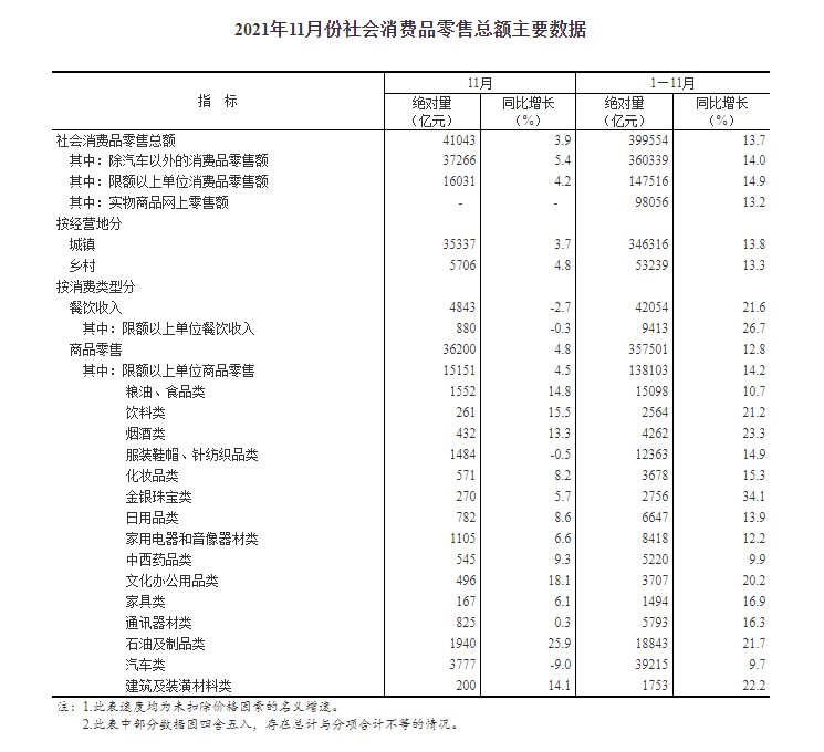 2021年11月份社会消费品零售总额增长3.9%