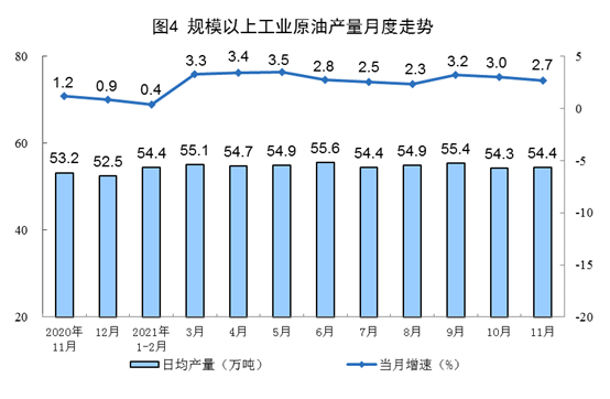 1—11月份,生产原油18248万吨,同比增长2.5%,比2019年同期增长4.2%,两年平均增长2.1%;加工原油64479万吨,同比增长4.9%,比2019年同期增长8.2%,两年平均增长4.0%。