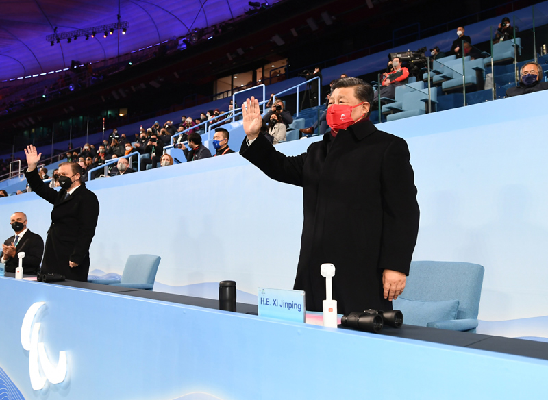 3月13日晚,北京2022年冬残奥会闭幕式在国家体育场隆重举行。这是国家主席习近平在主席台上向大家挥手致意。新华社记者 谢环驰 摄