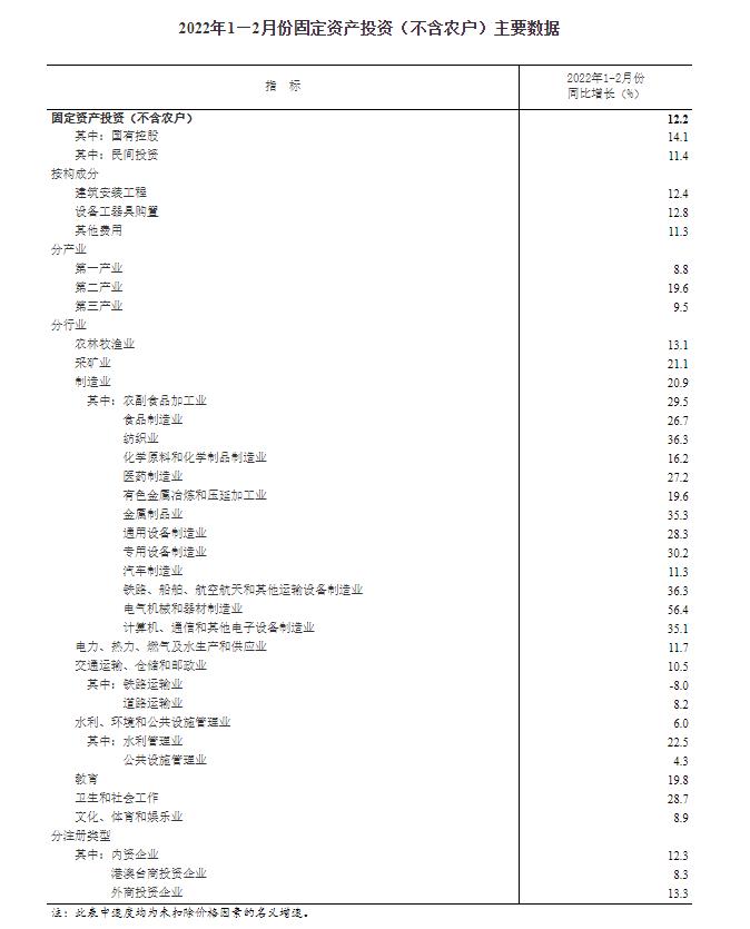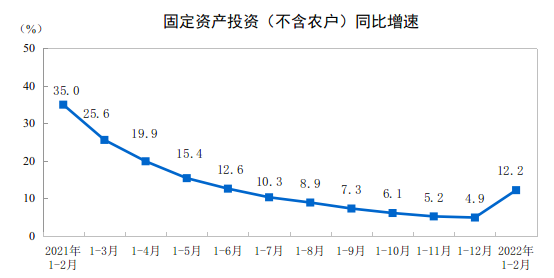 2022年1—2月份全国固定资产投资(不含农户)增长12.2%