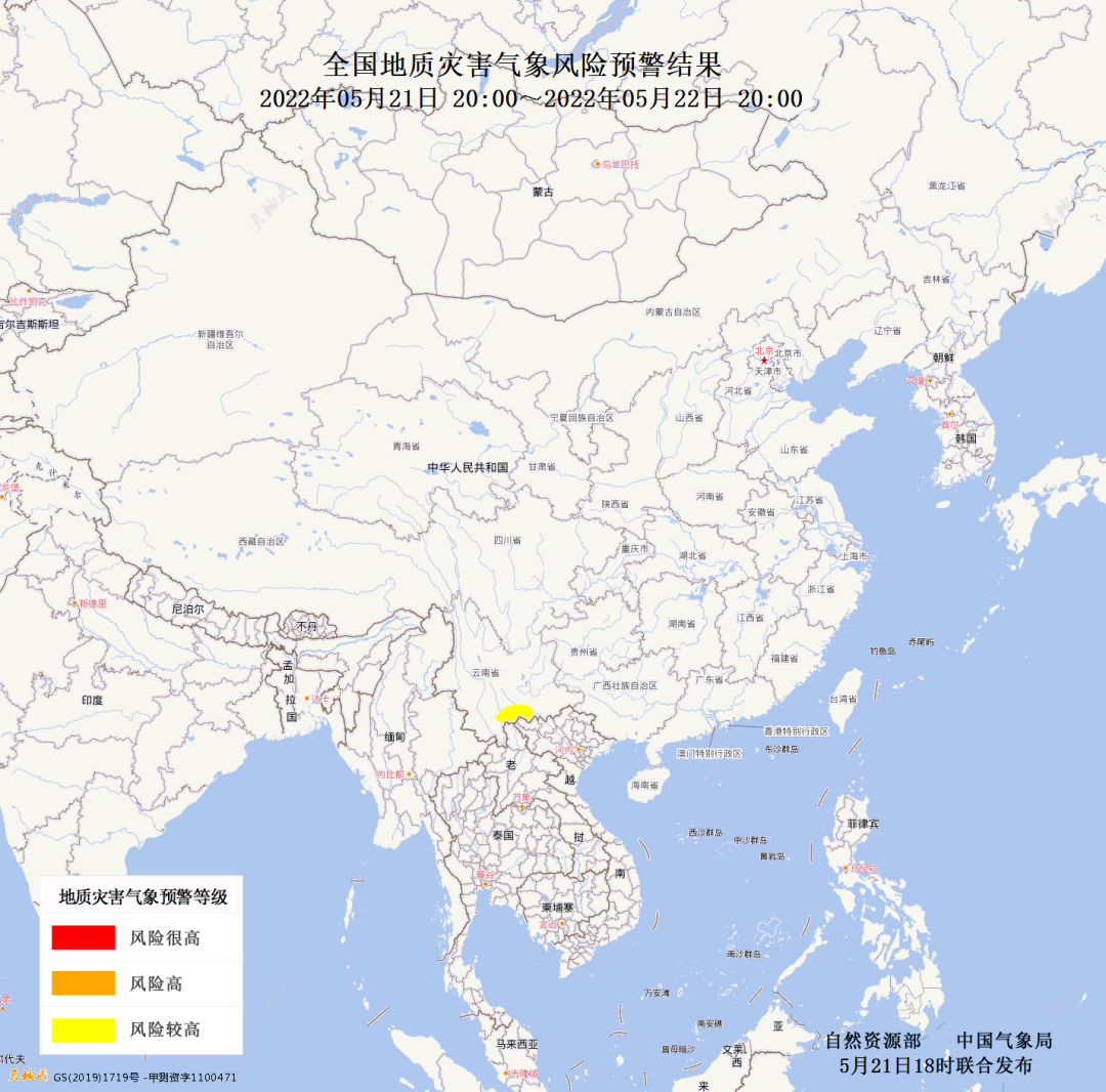 20220522地质灾害黄色预警 全国地质灾害气象预警服务 2022-05-21 自然资源部与中国气象局5月21日18时联合发布地质灾害气象风险预警:2022年5月21日20时至22日20时,云南南部局部地区发生地质灾害的风险较高(黄色预警)。