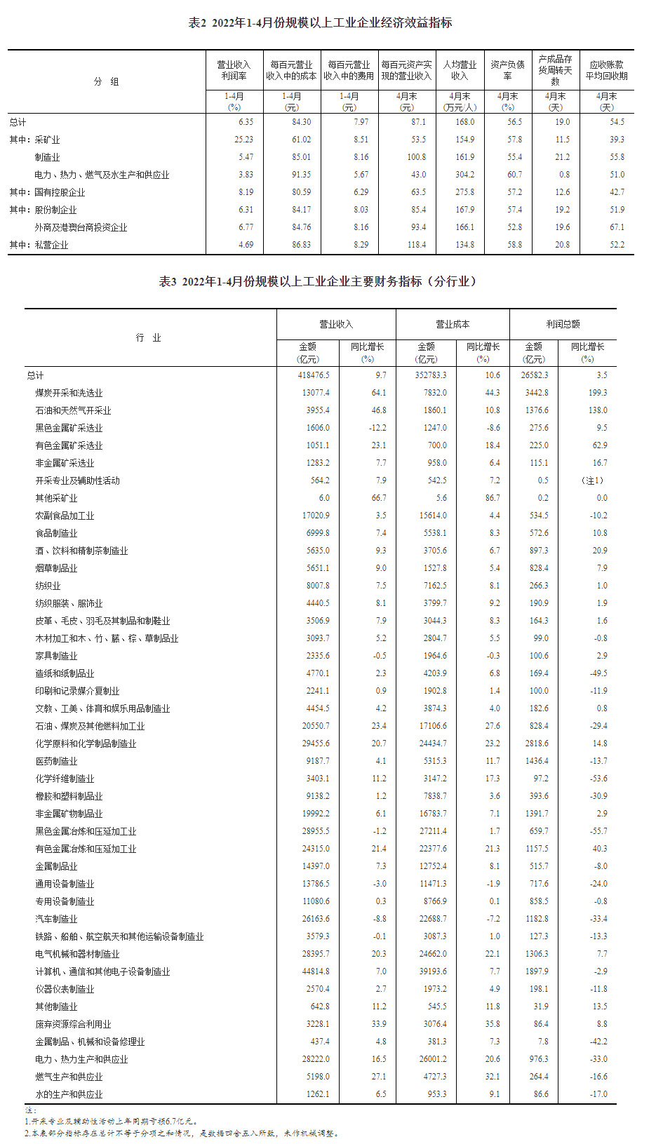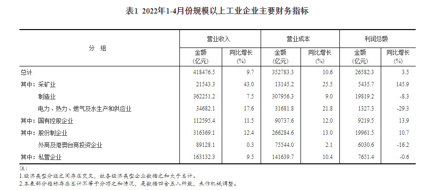 2022年1—4月份全国规模以上工业企业利润增长3.5%