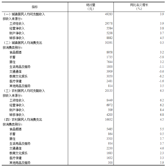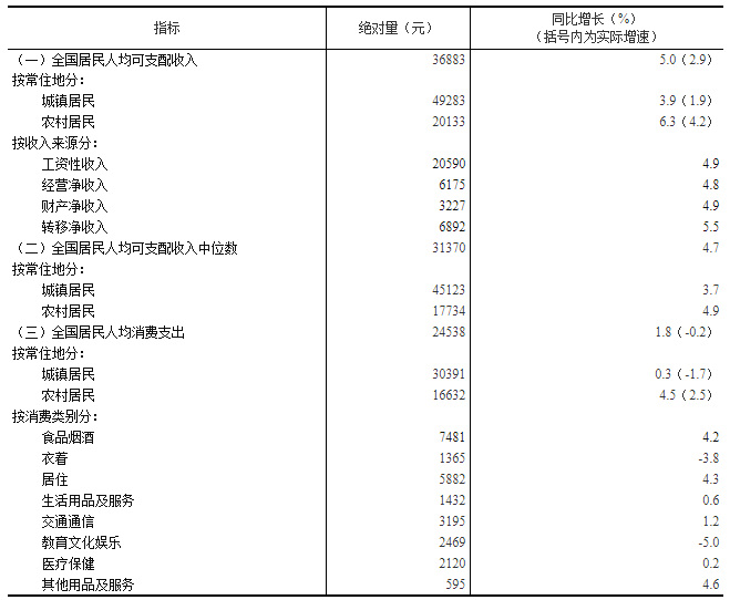 ②居民人均可支配收入名义增速=(报告期居民人均可支配收入/基期居民人均可支配收入-1)*100%;居民人均可支配收入实际增速=(报告期居民人均可支配收入/基期居民人均可支配收入/报告期居民消费价格指数*100-1)*100%。