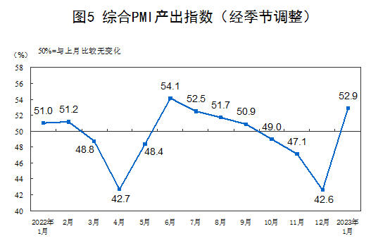 1月份,综合PMI产出指数为52.9%,比上月上升10.3个百分点,高于临界点,表明我国企业生产经营景气水平有所回升。