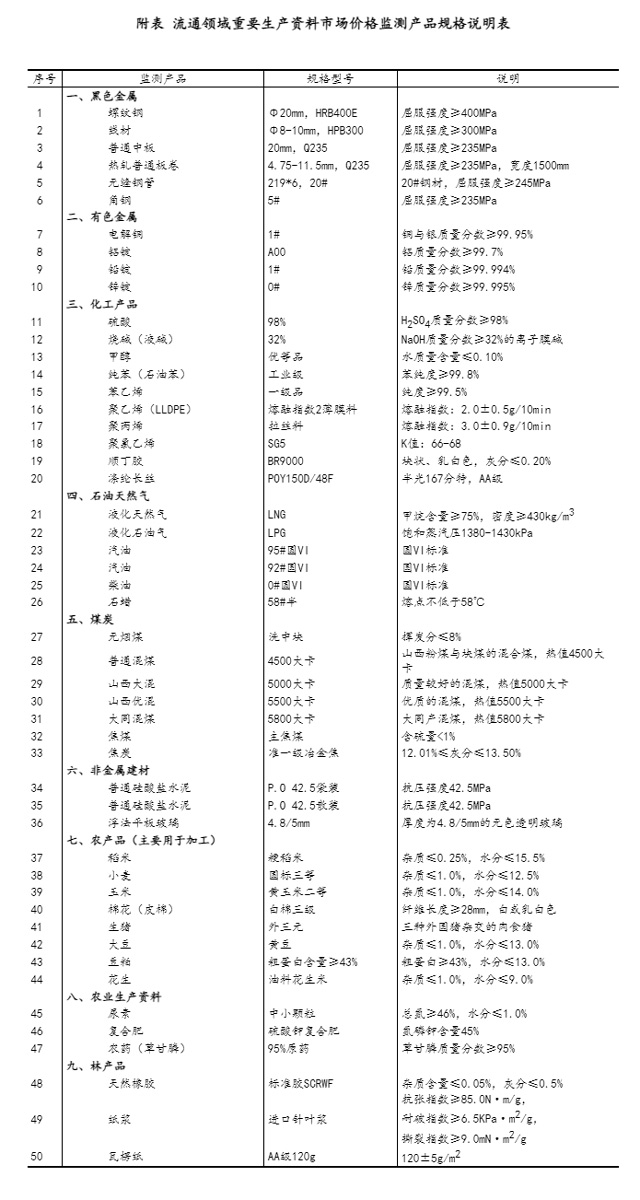 流通领域重要生产资料市场价格监测内容包括9大类50种产品的价格。类别与产品规格说明详见附表。