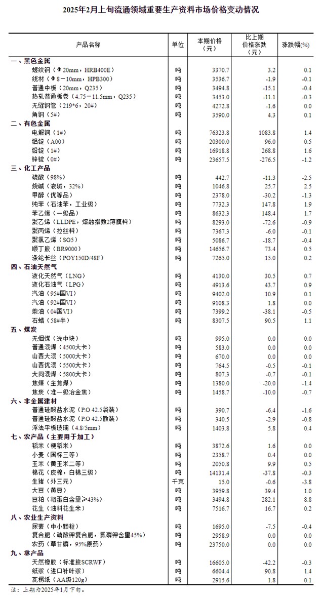 2025年2月上旬流通领域重要生产资料市场价格变动情况