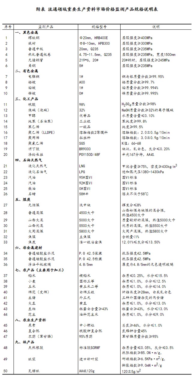 流通领域重要生产资料市场价格监测内容包括9大类50种产品的价格。类别与产品规格说明详见附表。
